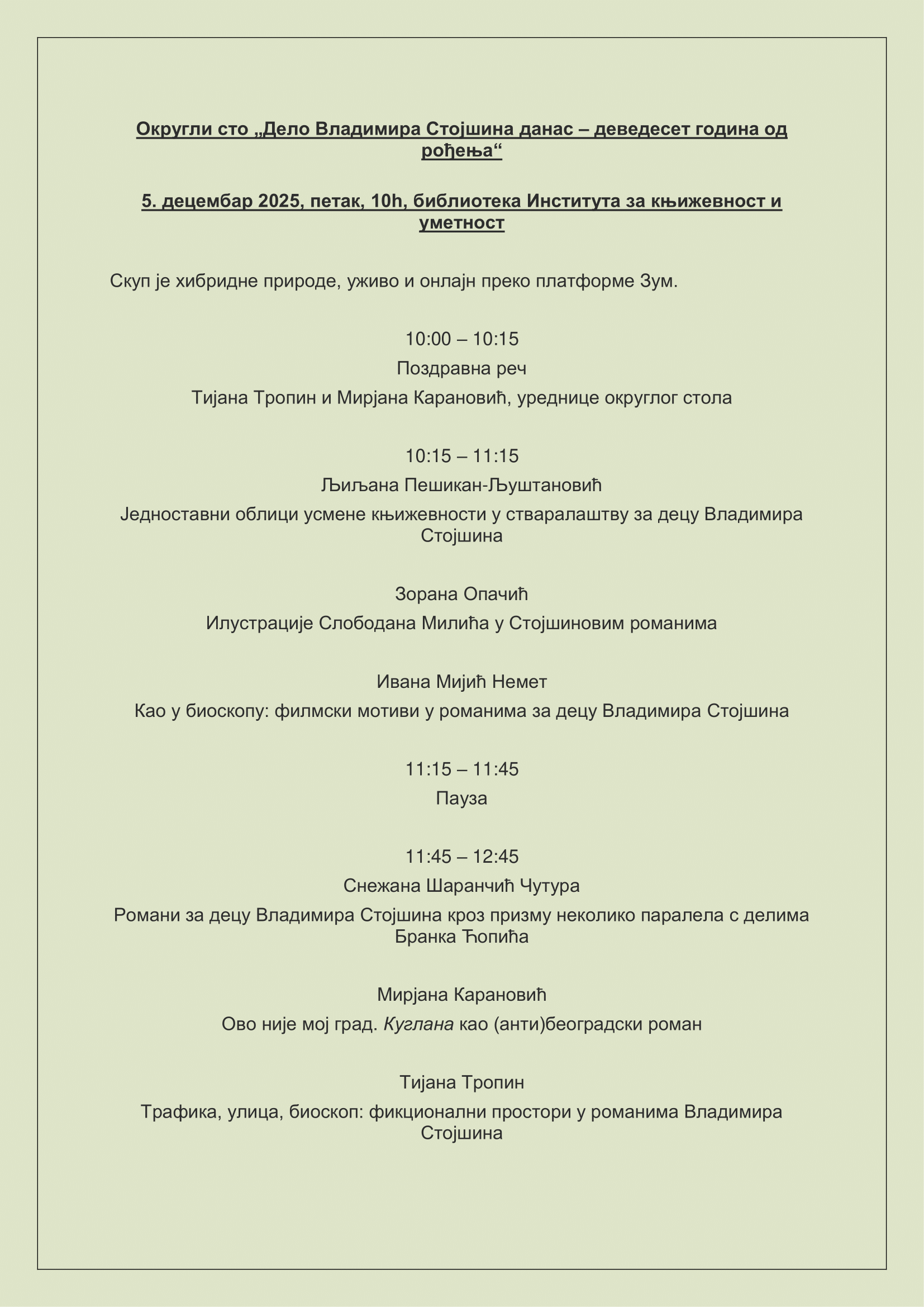 Одељење "Упоредна истраживања српске књижевности" организује округли сто посвећен делу Владимира Стојшина (1935-1994), данас најпознатијег по својим романима за децу Биоскоп у кутији шибица и Шампион кроз прозор. Позивамо све заинтересоване да присуствују догађају уживо или преко Зума. Програм можете наћи на линку.